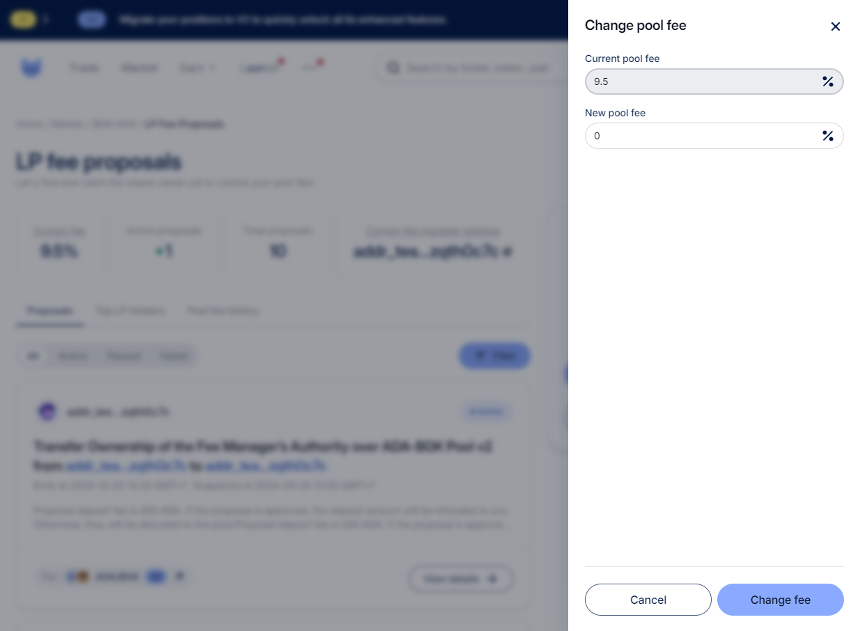 As a Fee Manager, you will see that the “Change fee” button is enabled on the LP fee proposals page.